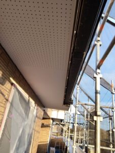 本日は軒天井塗装、外壁の上塗り作業を行いました。