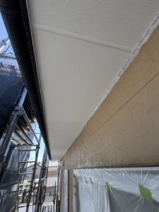 屋根の上塗り、外壁の中塗り、軒天井の塗装作業を行いました。
